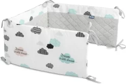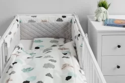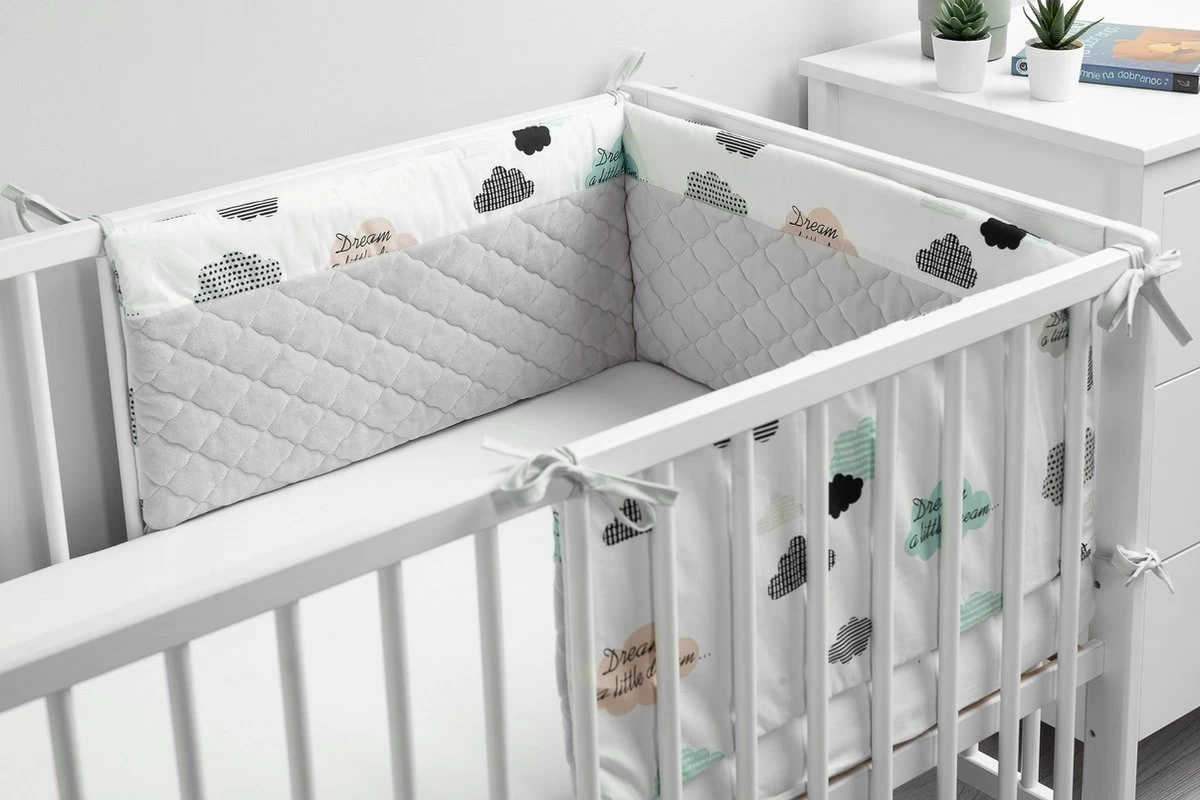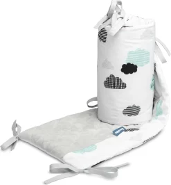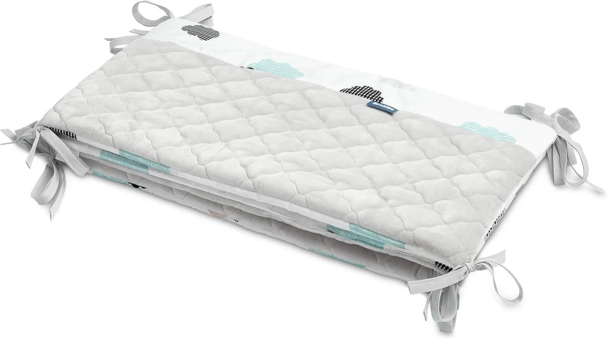 De bedbumper van Sensillo Baby is een perfecte aanvulling op de babyuitzet. De wattenvulling beschermt het kind tegen verwondingen tijdens het bewegen rond het bed en scheidt zich van de koude muur, de mooie materialen versieren de babykamer. De ene kant van de beschermer is gemaakt van zacht katoen met een print en de andere kant is van hoogwaardig, zacht aanvoelend pluche. Doormiddel van koort bevestigingen wordt de bumper in de juiste positie gehouden. De bedbumper is ontworpen voor een bed met een afmeting van 120×60 cm.
