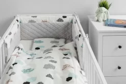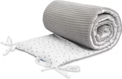 De dunne bedbumper van Sensillo is een alternatief voor dikke en zware bumpers die veel worden gebruikt in kinderbedden. De dunne anti-allergische eivormige vulling zorgt voor voldoende isolatie, beschermt het kind tegen verwondingen tijdens het bewegen in het bed, is vooral veilig en minimaliseert het risico op verstikking. De unieke uitstraling van de bumper bestaat uit een combinatie van twee materialen. De ene kant is gemaakt van zacht en aangenaam aanvoelend katoen met een wafelstructuur en de andere kant is van katoen met een kleurrijke print. Beide stoffen zijn Oeko-Tex gecertificeerd. Om de 30 cm zorgen ingenaaide tapes ervoor dat de bumper op de juiste plaats blijft.