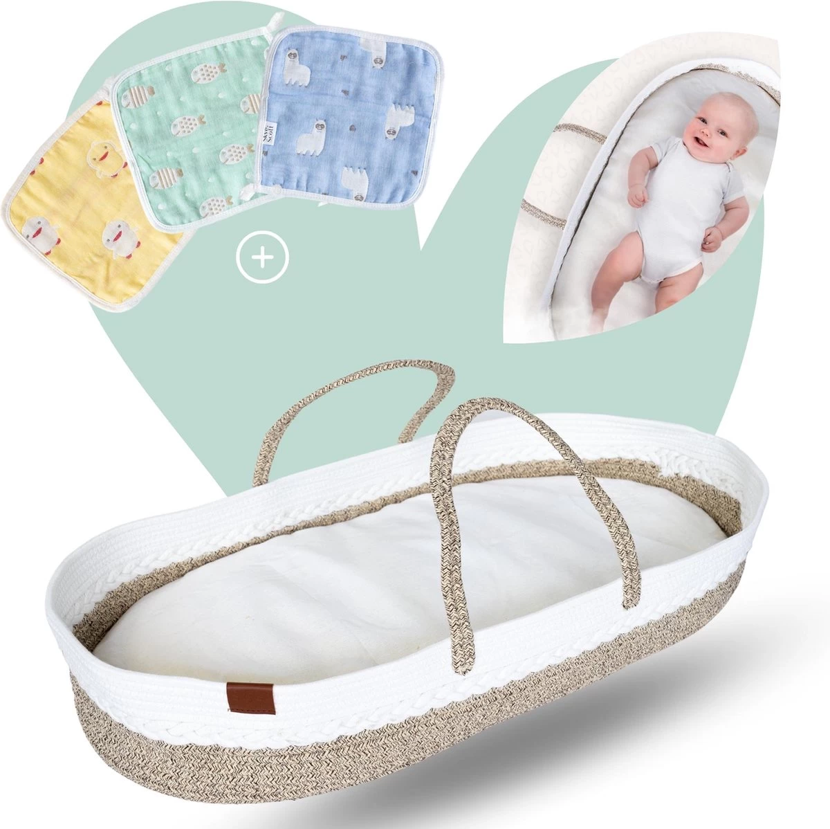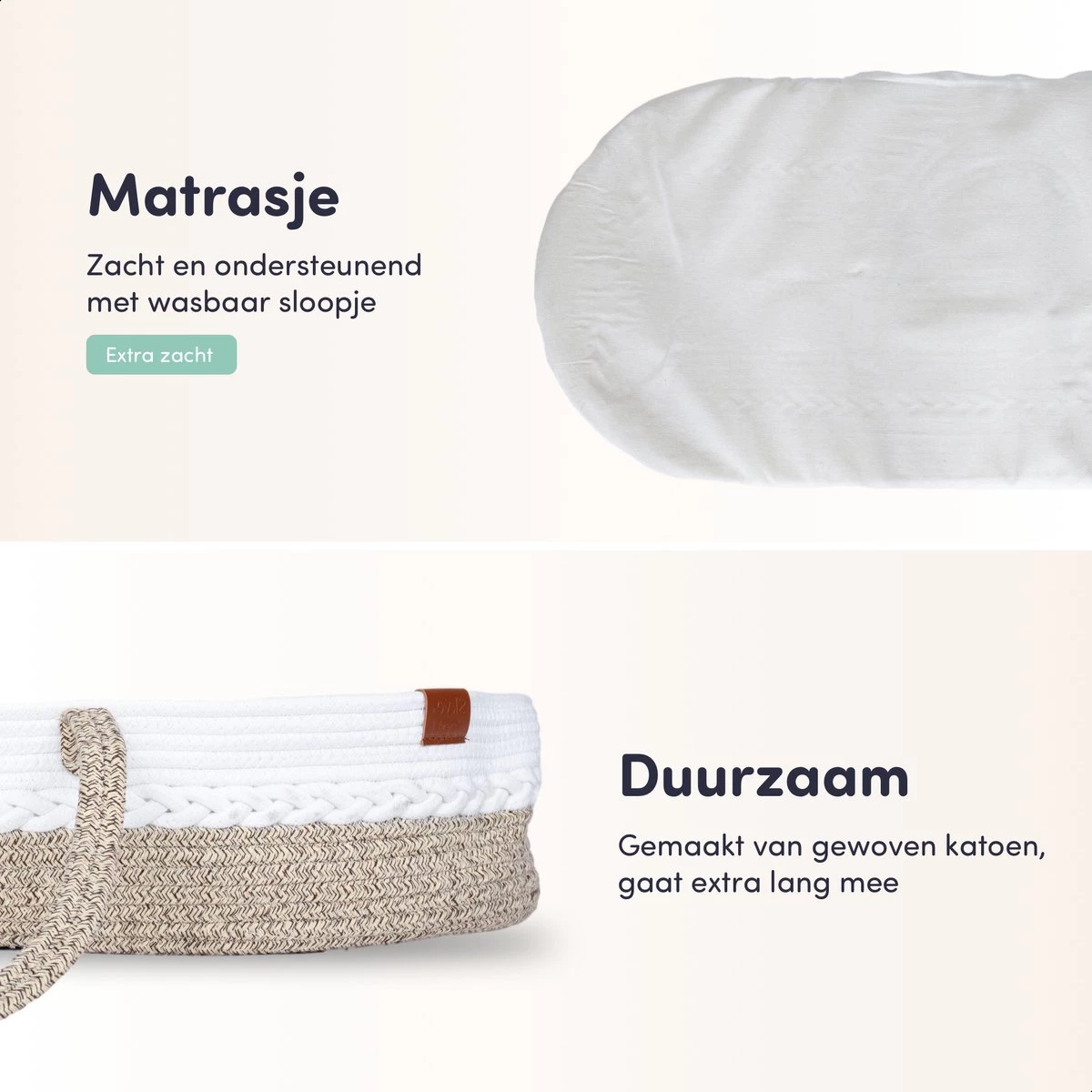 Handgemaakt van katoenen touw, wat resulteert in een zachte, flexibele én sterke verschoonmand. Door het dik bijgeleverd matrasje van 3 centimeter ervaart je ukkepuk een fijne en comfortabele tijd in de Mozesmand.