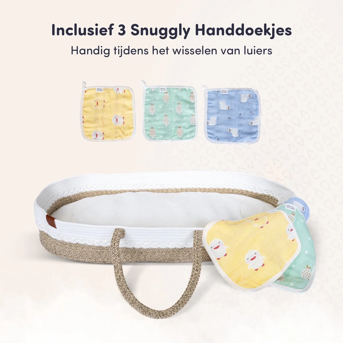 Skye & Scott introduceert de handgemaakte verschoonmand inclusief matrasje en drie Snuggly Handdoekjes. De knusse mand dient als aankleedkussen en is een ware toevoeging voor elke babykamer. Handgemaakt met liefde, voor jouw geliefde.