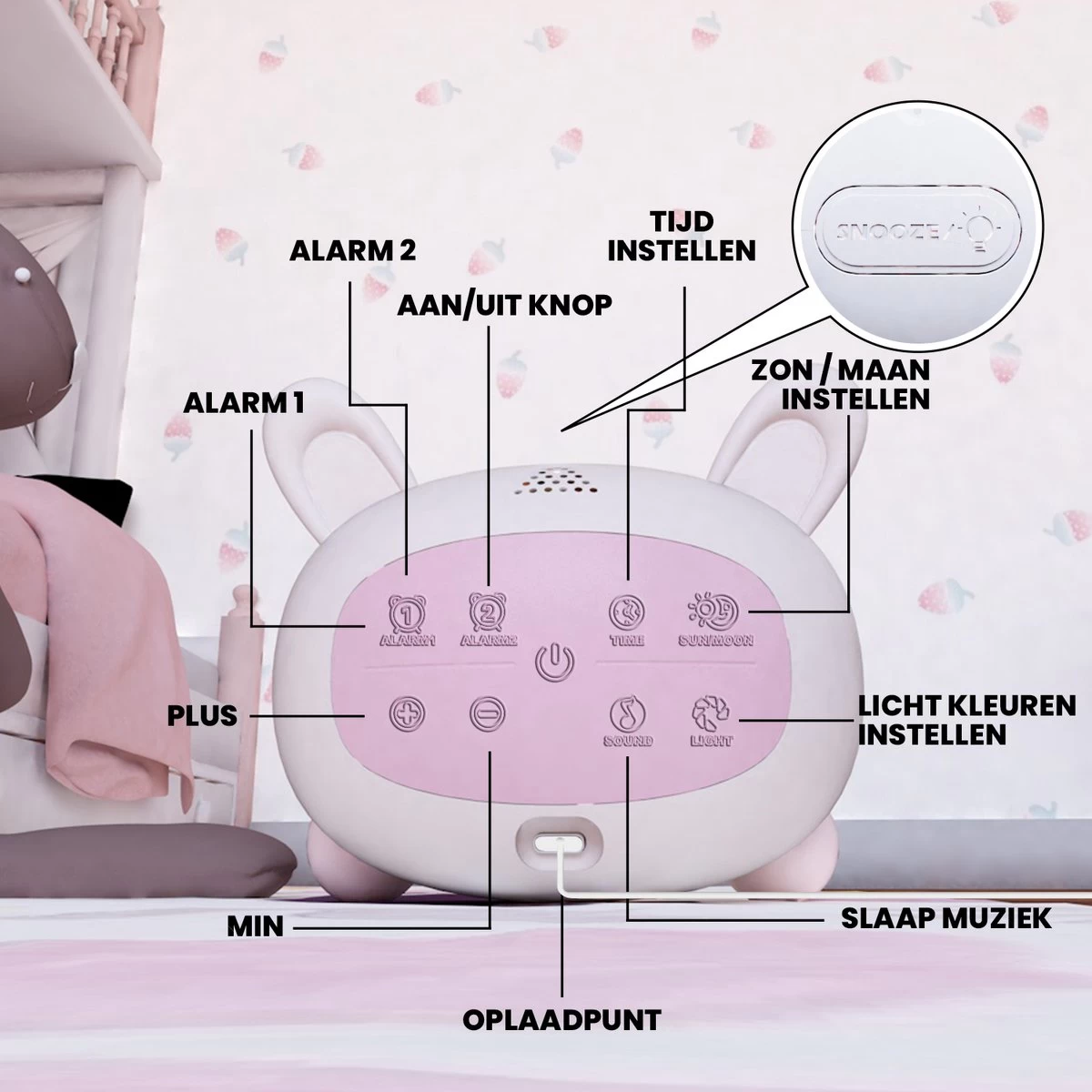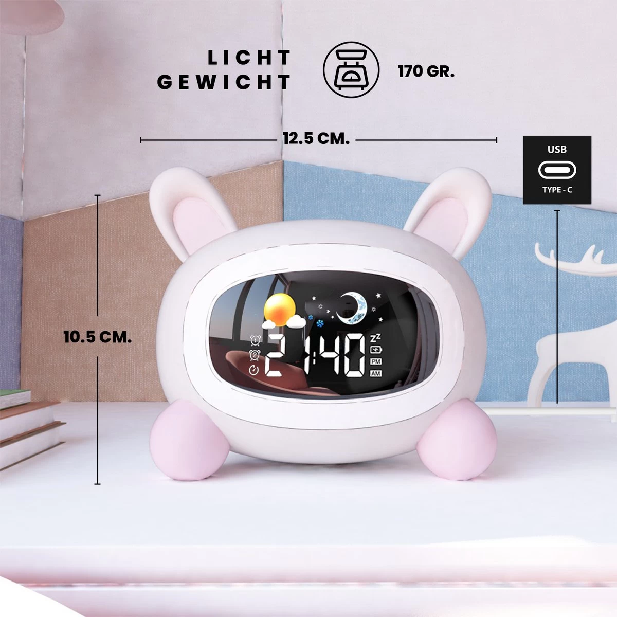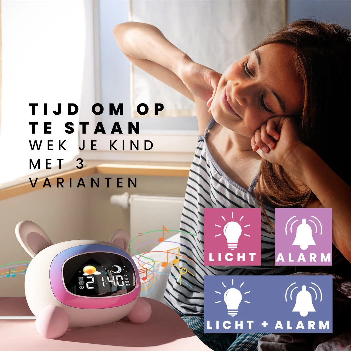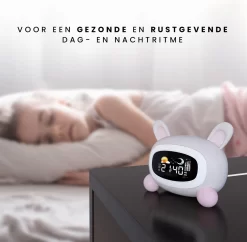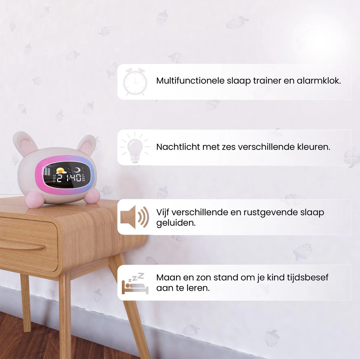 De kinderwekker heeft niet 1, maar meerdere functies om jou en de kleine de ideale slaaptrainer te bieden. Jij kan zelf de digitale wekker instellen op de juiste tijd dat het tijd is om op te staan. De wekker zal eerst het alarm laten afgaan, vervolgens zal het licht aangaan waarna vervolgens het alarm uitschakelt en het licht aan blijft staan. Op het display zal een zonnetje knipperen om te laten zien dat de dag is begonnen en het tijd is om op te staan! Daarnaast heeft de slaaptrainer ook de functie om als nachtlampje gebruikt te worden en kun jij, wanneer het kind wat ouder is, ook leren om digitaal klok te leren lezen.