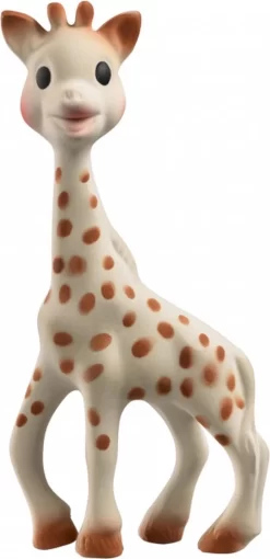 Geboren in Frankrijk in 1961. En al meer dan 60 jaar niets veranderd….. Sophie de giraf is het eerste bijtspeeltje dat de 5 zintuigen van baby stimuleert. Ze is geliefd bij miljoenen baby’s over heel de wereld. Sophie de giraf wordt al generaties lang met de hand geproduceerd in Frankrijk. Ze wordt gemaakt van 100% natuurlijk rubber afkomstig van de Hevea boom en bewerkt met verf die gebruikt wordt in de voedingsmiddelenindustrie. Hierdoor is ze absoluut vrij van schadelijke stoffen zoals PVC, Phthalaten, BPA en andere weekmakers, kortom een veilig en duurzaam speeltje. Het is hierdoor ook niet meer dan logisch dat deze superster al zoveel prestigieuze awards in de wacht heeft gesleept! Sophie is ongeveer 18 cm lang en kan door baby’s met hun kleine handjes makkelijk worden vastgepakt aan haar lange nek of benen. Haar vlekjes en lieve glimlach wekken door het contrast de aandacht van de baby en zorgen ervoor dat de baby haar herkend. Doordat Sophie is gemaakt van natuurrubber heeft ze een bijzondere geur waardoor de baby haar ook makkelijk herkent tussen alle speeltjes. Het subtiele piepje van Sophie stimuleert het gehoor en zorgt ervoor dat de baby kennis maakt met oorzaak-gevolg. En wanneer baby tandjes krijgt, bieden de oortjes en lange poten van Sophie verlichting door erop te sabbelen en te bijten. Sophie is verpakt in een mooie geschenkdoos en is hierdoor ook erg leuk om weg te geven als kraamcadeau. Geschikt voor 0+ maanden Schoonmaakadvies: Sophie kan worden schoongemaakt met een licht vochtig doekje met wat zachte zeep. Wij adviseren Sophie niet onder de kraan te houden of in bad te doen, het piepje van Sophie kan hierdoor onherstelbaar beschadigen. Let op: Sophie niet steriliseren of in de vaatwasser reinigen!