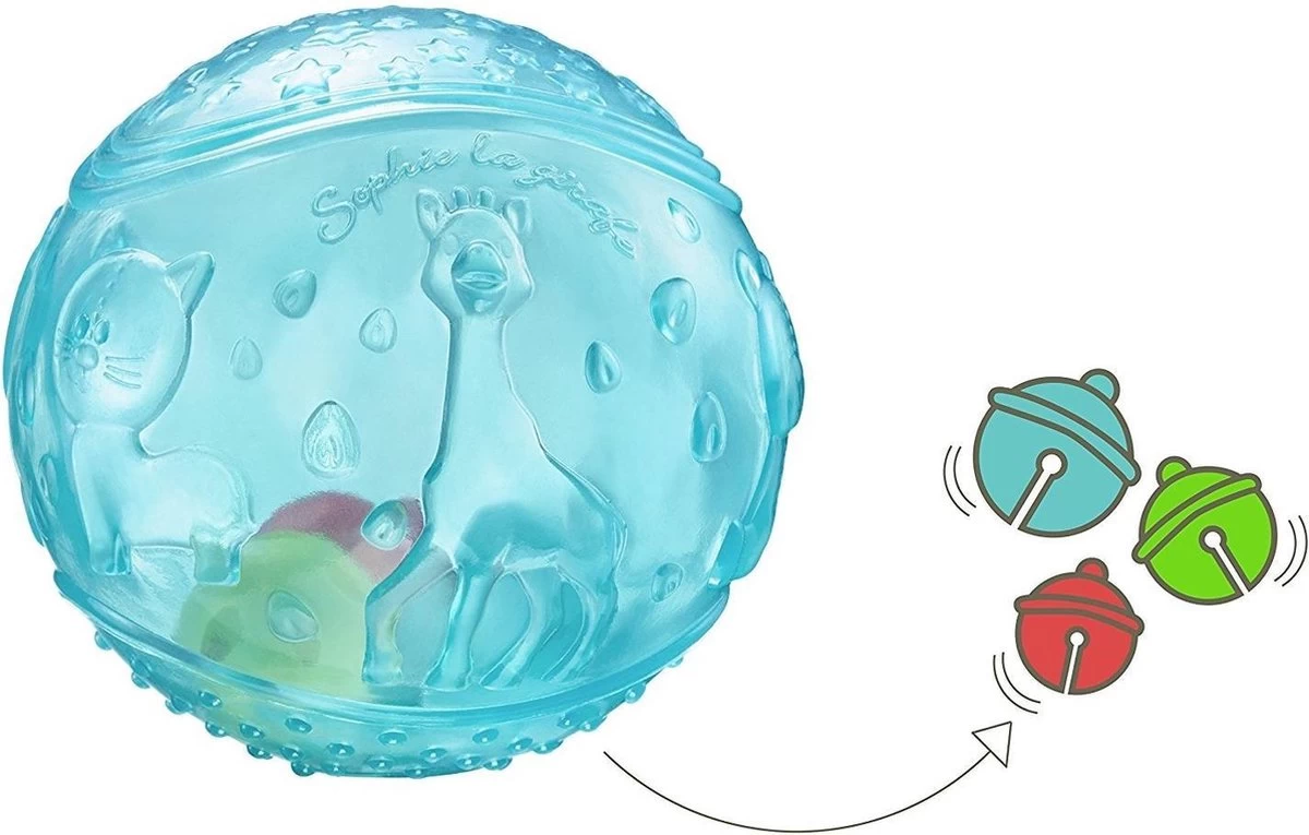 Deze bal is ontwikkeld om baby’s zintuigen te stimuleren! Het oppervlak van de bal bevat verschillende texturen. Baby kan hierdoor Sophie de giraf, haar vrienden en verschillende vormen ontdekken. De bal is ideaal om behendigheid en bewegingen te ontwikkelen en bevat gekleurde bellen om het gehoor en zicht te stimuleren.