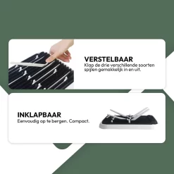Het inklapbare design van het STACK Flessen Droogrek is uitgerust met 12 spijlen van verschillende formaten. Drie verschillende formaten zorgen ervoor dat u uw flessen of accessoires altijd op de gewenste manier neer kunt zetten. U bepaalt zelf welke spijlen u omhoog zet! Heeft u niets meer te drogen? Klap dan alle spijlen in tot een compact geheel. Onder het spijlenrek bevind zich de lekbak. Deze bak vangt het water op, is snel uitneembaar en maakt u gemakkelijk schoon in de vaatwasser.