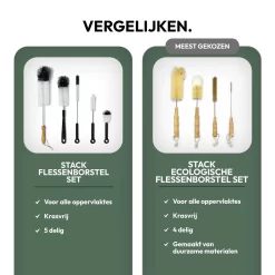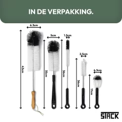 De STACK Flessenborstel Set bestaat uit diverse formaten aan flessenborstels die te gebruiken zijn om moeilijk bereikbare vlekken of overblijfselen in mokken, (baby)flessen, glazen, bidons, de speen van uw babyfles of bijvoorbeeld smalle bloemvazen in een handomdraai te verwijderen. Ook voor het reinigen van moeilijk bereikbare oppervlakken in het huishouden is de set onmisbaar. Denkt u bijvoorbeeld aan de afvoer in uw keuken of badkamer, achter verwarmingsbuizen, in bouwkundige naden of kieren of bijvoorbeeld ventilatieroosters. De Flessenborstel Set is een onmisbaar hulpmiddel voor in het huishouden!