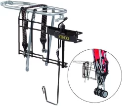 Met de buggydrager van buggy mee kunt u eenvoudig en veilig een buggy van maximaal 7 kilo meenemen. Eenvoudig maar stevig te monteren aan de linkerzijde van de fiets. De buggy wordt op 3 punten vastgezet aan de fiets. Deze drager is geschikt voor bijna elk model buggy. De ophangbeugel klapt automatisch weg voor de veiligheid van andere weggebruikers. Uitgevoerd met een sterke spanband, zodat uw buggy goed vast zit. De buggy hangt stevig en zeker niet te laag bij de grond.Deze buggydragen wordt geleverd inclusief montagematerialen en handleiding.