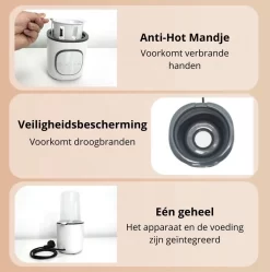 Beschikt over een veilig anti-hot mandje. Dit mandje wordt gebruikt om de fles of pot met babyvoeding vast te houden terwijl het wordt verwarmd. Het mandje is ontworpen om de fles of pot op zijn plaats te houden en te voorkomen dat deze tijdens het verwarmen omvalt of verschuift.