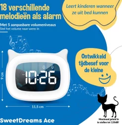 De SweetDreams Slaaptrainer brengt daar verandering in! Zelfs voor de kleinste koters die nog niet (goed) kunnen klok kijken is dit de perfecte oplossing. Zodra een van de vrolijke geluiden afgaat is om op te staan en dan kan de dag beginnen. Super handig!
