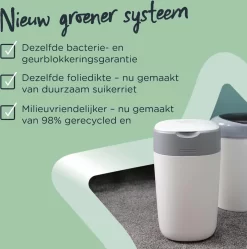 - Nu nog milieuvriendelijker***: De Twist & Click-luieremmers en het navulchassis zijn gemaakt van 98% gerecycled en volledig recyclebaar plastic en bevatten nu antibacteriële GREENFILM™, gemaakt van duurzaam geproduceerd suikerriet