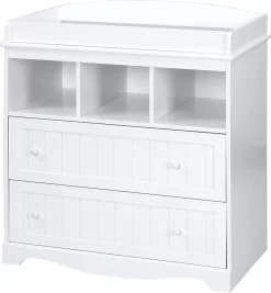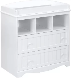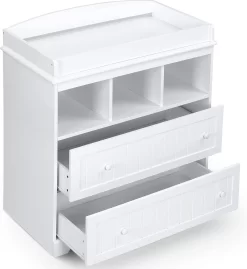 Eenvoudig ontwerp en veel opbergruimte maken deze moderne commode. In twee lades en drie compartimenten is er genoeg ruimte voor luiers, kleding, verzorgingsproducten en al het andere dat altijd bij de hand moet zijn in het dagelijks veranderende leven. Op het royale verschoningsoppervlak kunnen luiers comfortabel worden verschoond. De witte kleur past bij elke kinderkamer en is te combineren met een breed scala aan meubels. Dit meubel kan later gebruikt worden als ladekast.