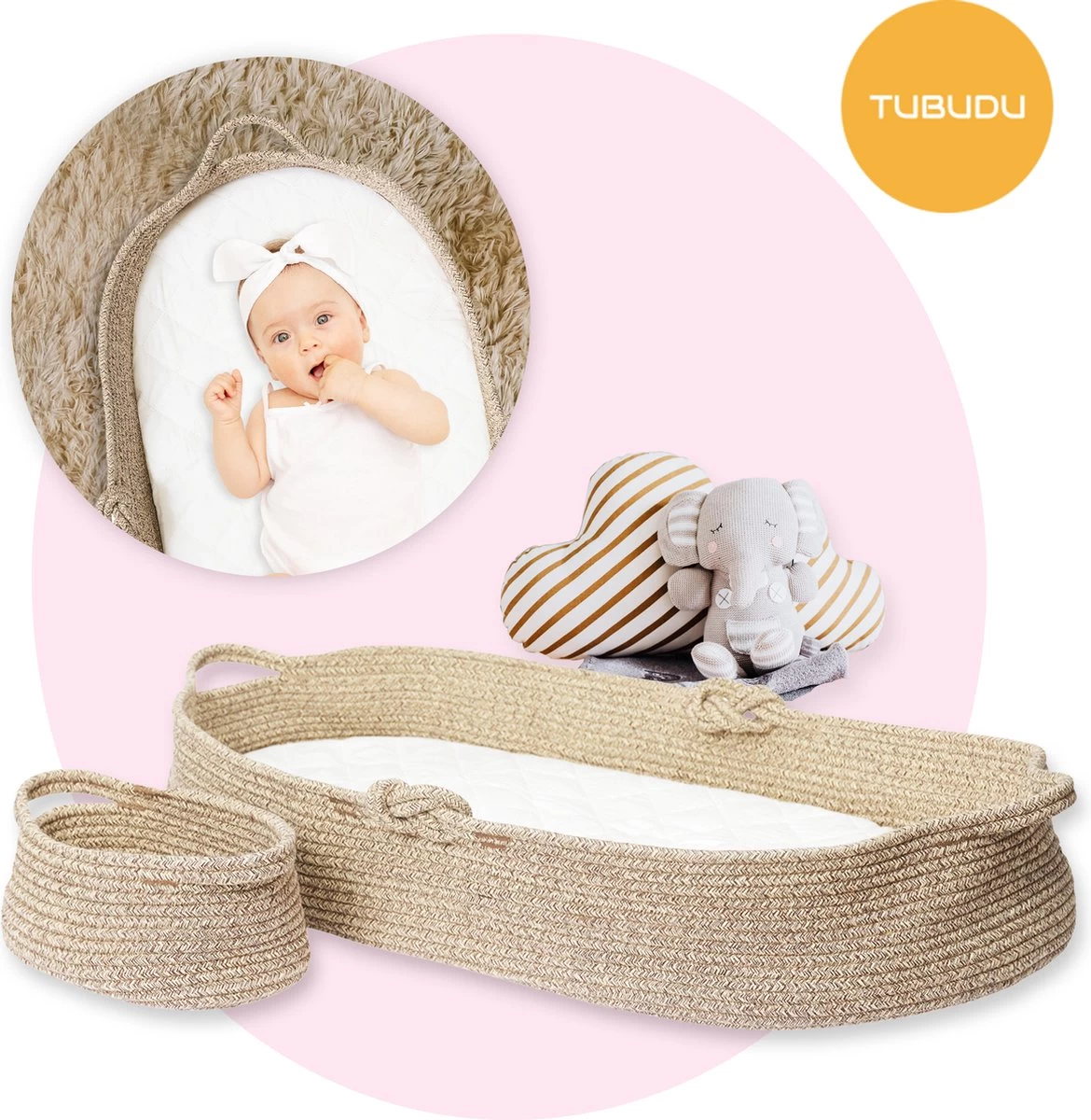 De nieuwe, revolutionaire Mozesmand van Tubudu is een ideaal aankleedkussen met zacht matras waar jij en je baby veel plezier van zullen hebben. Gebruik de decoratieve mandenset bij verschoningen van je baby of om je baby fijn in te laten liggen terwijl jij iets anders aan het doen bent.