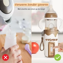 Stel je voor dat je je kleintje warme melk kunt geven, net als bij de bron! De Twinky® 2-in-1 Flessenwarmer maakt dit mogelijk met zijn snelle en efficiënte verwarmingstechnologie. Je hoeft niet meer te wachten tot het water kookt of de temperatuur op je pols te testen. Met onze flessenwarmer heb je altijd de perfecte temperatuur!