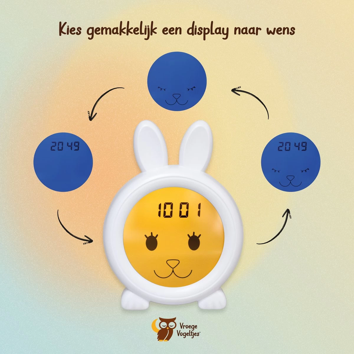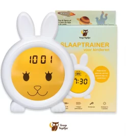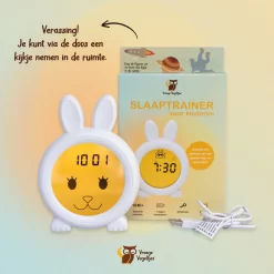 Deze slaaptrainer helpt jouw vroege vogeltje met het aanleren van een gezond dag en nachtritme met simpele symbolen en kleuren. Je stelt in hoe laat het tijd is om te gaan slapen en hoe laat je kind uit bed mag. Je legt uit dat het pas tijd is om op te staan als het lampje geel is. ’S nachts zal het blauw oplichten en zo zal je kind weten dat het nacht is, dus tijd om op bed te liggen. Ook zijn er symbolen op het schermpje afgebeeld: Wanneer het nacht is een lief maantje en een vrolijk zonnetje voor overdag.