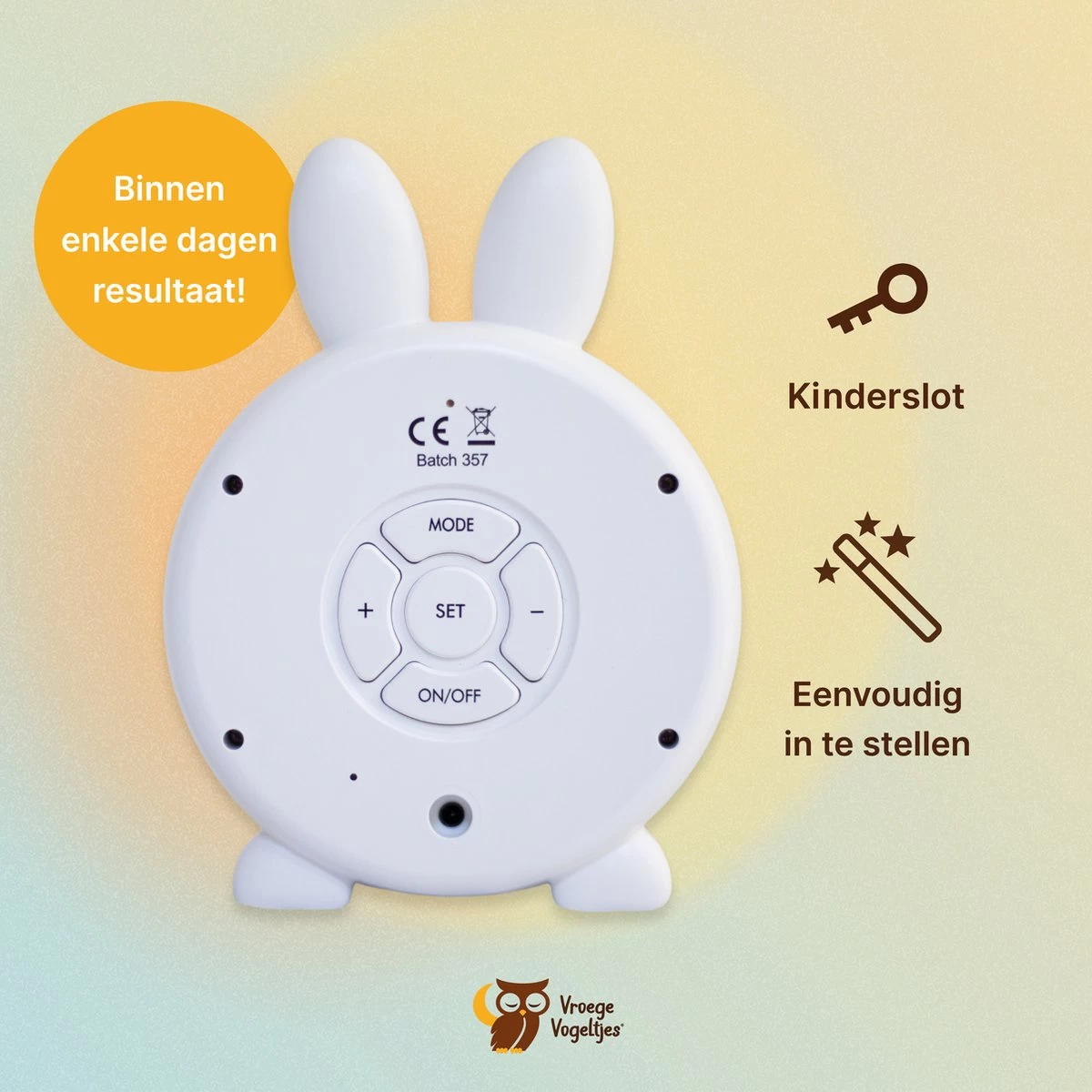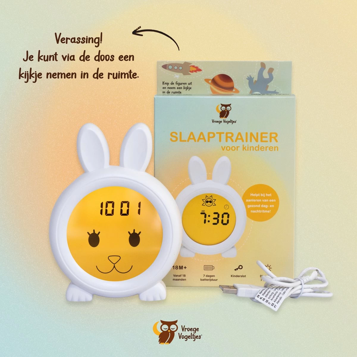 De slaaptrainer heeft een vrolijke uitstraling en je kind zal zo trots zijn als een pauw als hij/zij de regeltjes begrijpt