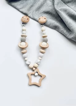 Met een houtenwagenspanner van Complete Babyuitzet ga je met je baby stijlvol op pad. Deze sierlijke wagenspanner heeft een hip design met een leuke combinatie van silicionen, houten en gehaakte kralen.