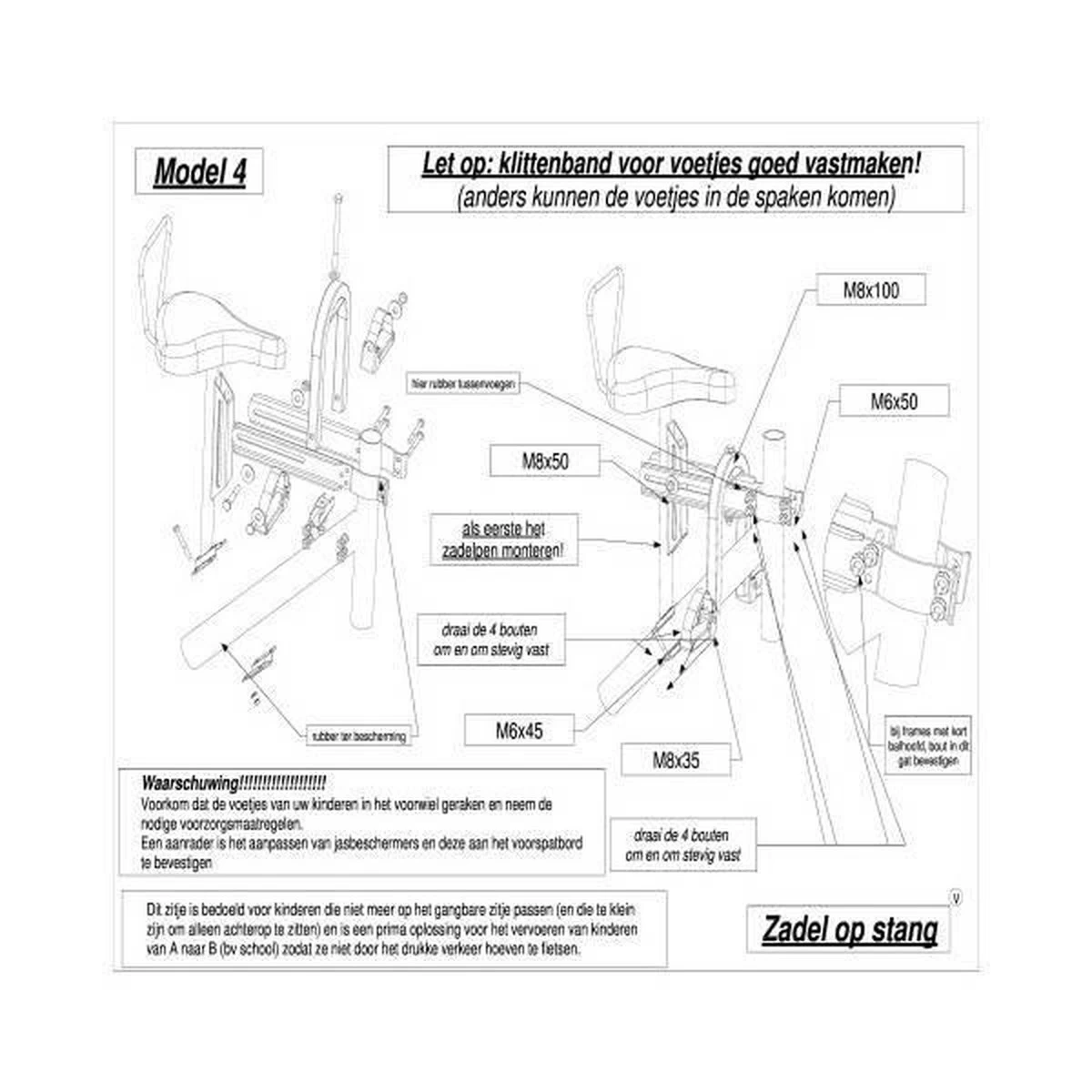Nu u de afmetingen weet kunt u de fietsstangen opmeten om te kijken of het zitje ook bij u op de fiets past. Is dit niet het geval dan is er ongetwijfeld een van de andere zadel op stang modellen die wél bij uw fiets past. Heeft u een damesfiets met twee stangen en is de onderbuis van uw damesfiets dikker dan 60 milimeter doorsnee? Dan heeft u waarschijnlijk Model 3 nodig. Heeft u een damesfiets met een onderbuis van maximaal 60 milimeter? Dan is model 1 hoogstwaarschijnlijk het juiste model voor u! Heeft u een herenfiets, kijk dan bij model 2 of 5. Komt u hier niet uit? Vraag het aan de verkoper en deze zal u hiermee verder helpen!