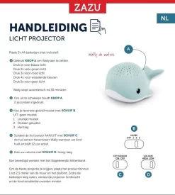 Wally projecteert waterdruppels in verschillende kleuren (blauw, groen, rood óf regenboogkleuren) tegen het plafond. Daarnaast speelt Wally drie verschillende melodieën, namelijk oceaan geluidjes, hartslag én slaapliedjes. Altijd een kleurtje en een geluidje dat bij jouw kindje past.