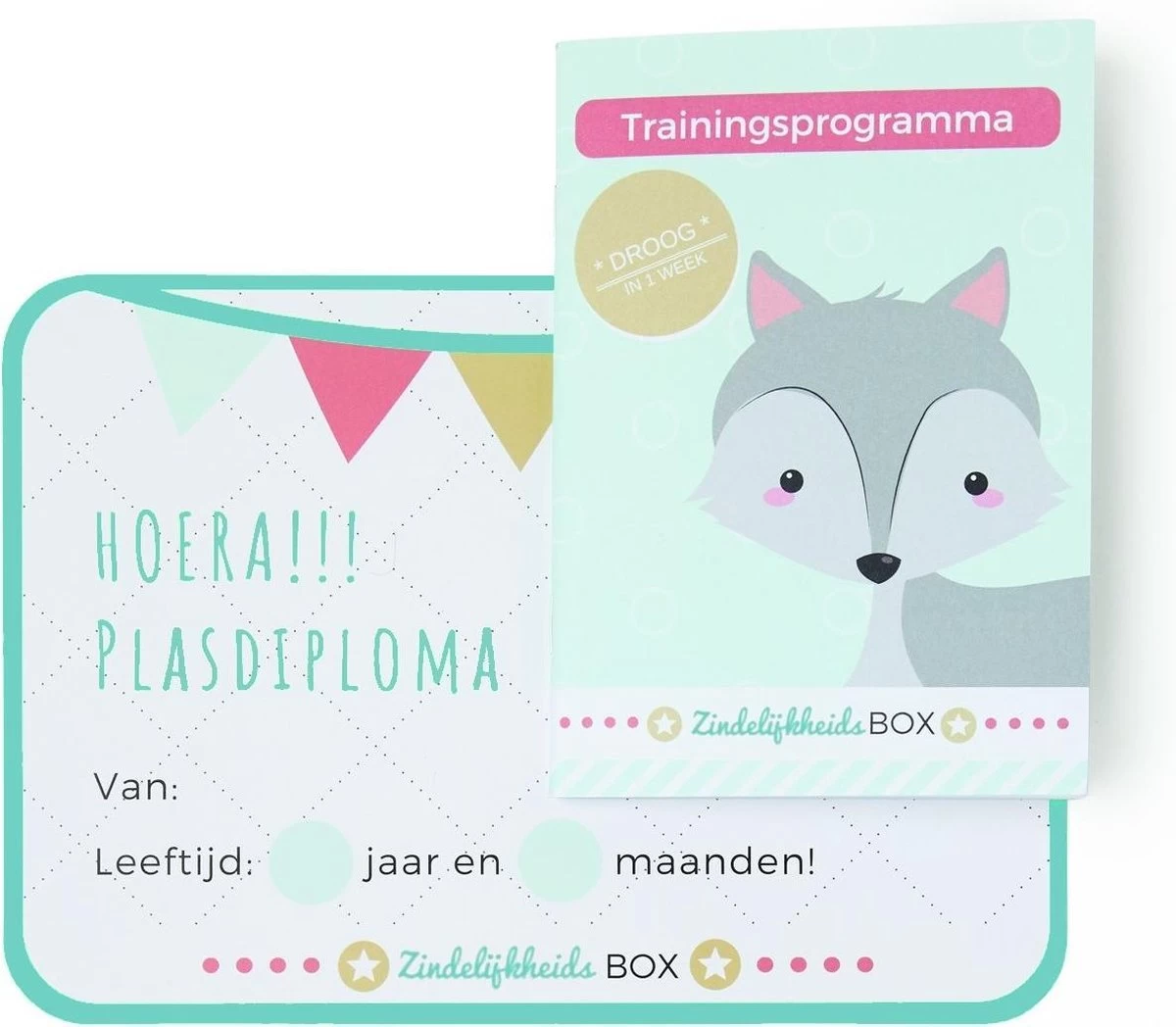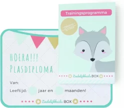 Het trainingsprogrammaboekje bevat instructies en veelgestelde vragen met antwoorden. De instructiekaarten geven je beknopte instructies per dag als herinnering. De complimentkaarten gebruik je als je even door je complimentjes heen bent. En met de zindelijkheidschema’s leer je de momenten kennen waarop jouw kind naar het toilet moet, zodat je de succeskans vergroot. Doe enthousiast en beloon je kind! Met stickerkaarten variërend van drie tot negen vakjes weet je wanneer, en kun je de beloningsfrequentie verlagen op het moment dat jouw kind daaraan toe is. Natuurlijk bevat de box ook vrolijke dierenstickers om te plakken, wanneer je kind een succeservaring heeft.
